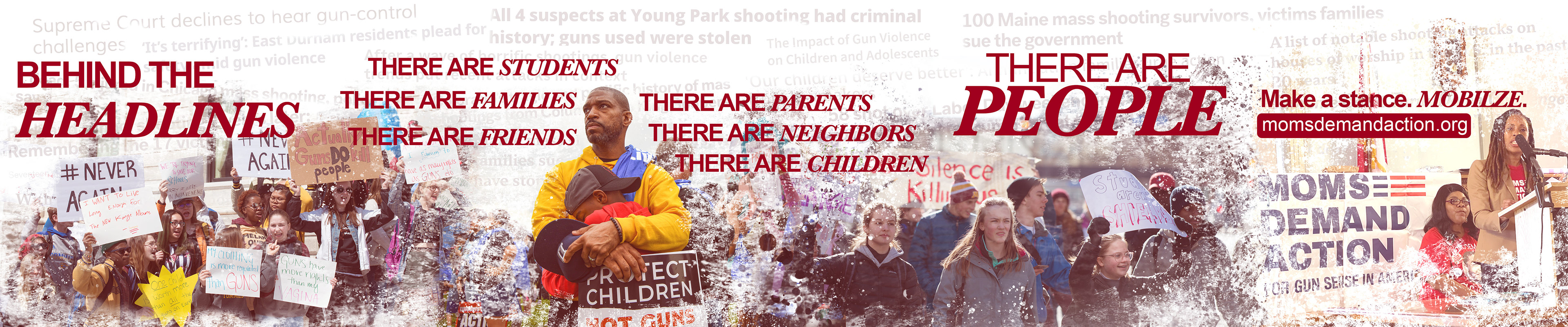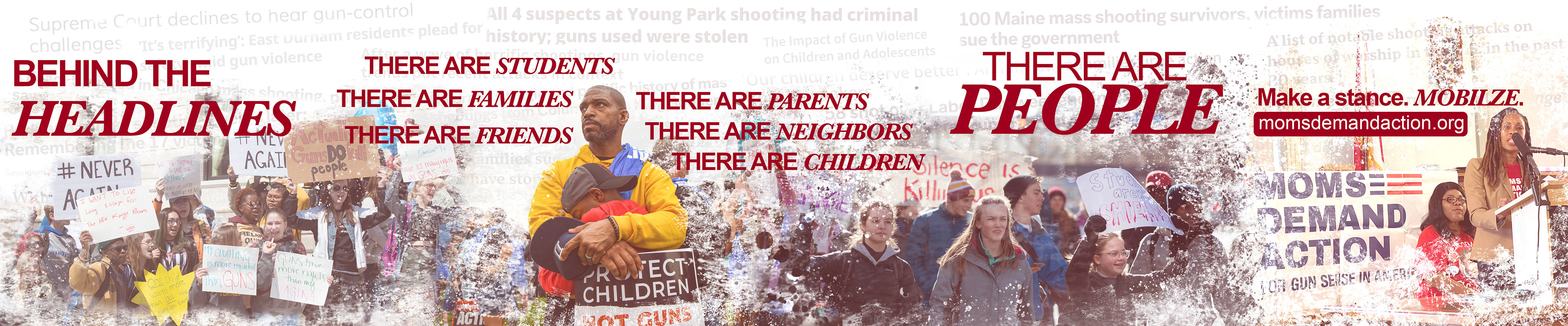 The project strategically uses pathos to connect with the audience’s awareness and emotional response to the steady stream of gun-violence headlines, expressed through the message: “Behind the Headlines, there are…” The color palette, paint-splatter textures, and brush effects symbolize urgency, and human presence behind activism—reflecting how individuals and organizations like Moms Demand Action mobilize, protest, and work collectively for change.